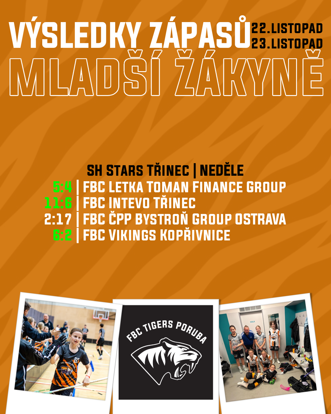 Ve druhém zápase jsme nastoupili proti FBC INTEVO Třinec, se kterým jsme letos hráli už jednou a tehdy šlo o velmi vyrovnaný souboj. Tentokrát jsme však byli jasně lepším týmem – výsledných 11 : 6 mluví samo za sebe. Po první polovině jsme dokonce vedli 8 : 1. Ani výborný výkon třinecké brankářky nedokázal zastavit naše gólové kombinace, do nichž se zapojovala celá smečka našich Tygřic. Byl to jeden z nejhezčích florbalových momentů, které jsme jako trenéři při turnajích zažili.